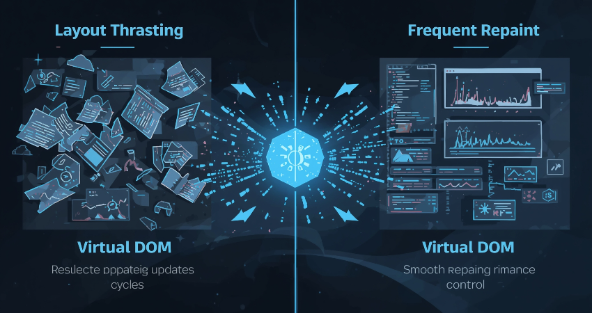 On the other hand, the Virtual DOM does not link any logic with supposed direct DOM operations. All of the state and component logic takes place against the Virtual DOM; there are no real layout calculations when these operations are being carried out. After diffing, only the necessary updates are sent to the real DOM, and they are also reordered or merged in such a way that layout reads and writes are grouped instead of interleaved. This lessens unnecessary layout thrashing, therefore minimizing computational costs and enabling smoother animations, transitions, and scrolling-all key performance factors, especially on lower-powered devices.